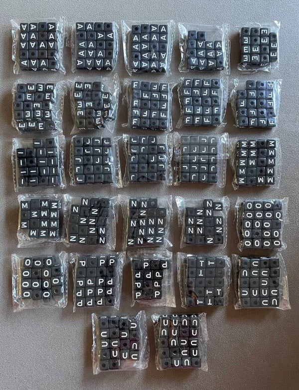 Totaal 1393 acryl letterkralen zwart, inclusief doosjes.